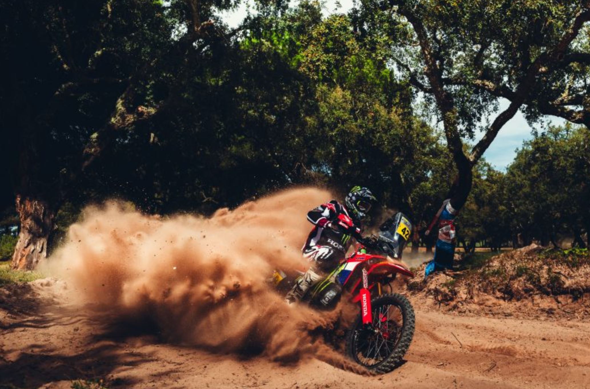 Ricky Brabec, der zum ersten Mal seit der Rallye Dakar im Januar wieder auf seiner Honda CRF450 RALLY saß, meisterte die rutschigen Bedingungen und kam nur zwei Sekunden hinter seinem Teamkollegen ins Ziel.