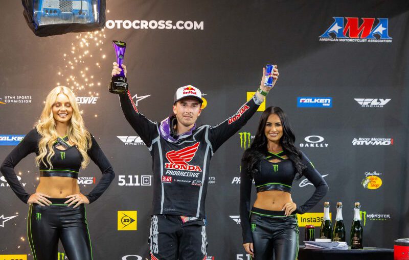 Lawrence sicherte sich den Holeshot im 450SX-Hauptrennen und führte den ersten Abschnitt auf seiner CRF450RWE an. Er wehrte wiederholte Angriffe von Ken Roczen ab, und Eli Tomac mischte sich bald in den Kampf ein. Das Rennen zwischen den ersten Drei war aggressiv, aber fair. Roczen und Tomac überholten Lawrence in Runde 8, doch der Honda-Fahrer fing sich wieder und blieb dran. Zu Beginn des letzten Viertels startete Lawrence eine seiner typischen Schlussspurts und überholte Roczen sechs Runden vor den Whoops. Anschließend holte er den führenden Tomac ein und versuchte in der letzten Runde ein Überholmanöver, bevor er nur 1,6 Sekunden hinter ihm ins Ziel kam. Ebenfalls beeindruckend war Joey Savatgy von Quad Lock Honda, der einen soliden fünften Platz belegte.