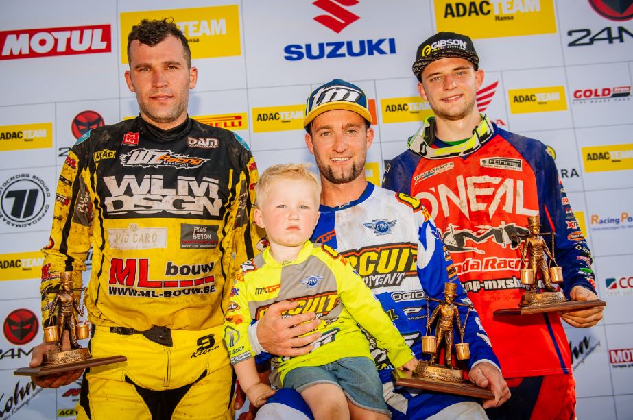 Henry Jacobi erwischte nach seinem Sieg im ersten Rennen keinen guten Start in den zweiten Lauf. In der ersten Runde kollidierte er mit einem vor ihm gestürzten Fahrer, ging dabei selbst zu Boden und fiel weit zurück. Bis er wieder einen guten Rhythmus gefunden hatte, war es zu spät für eine Platzierung in den Top Ten und der Thüringer musste sich mit Rang 13 zufriedengeben. Damit schlitterte Jacobi mit Gesamtrang vier denkbar knapp am Tagespodium vorbei. Zweiter in der Tageswertung wurde Ken de Dycker (WZ-Racing/KTM). Der Belgier zeigte mit den Plätzen fünf und vier eine konstante Leistung, geriet jedoch gegen Ende des zweiten Rennens unter Druck und musste in der Schlussphase noch zwei Fahrer passieren lassen. „Der Grund warum ich langsamer wurde ist schnell erklärt“, gab der 33-Jährige offen zu. „Ich bekam schon ab Mitte des Rennens Krämpfe in den Unterarmen und musste das Tempo deshalb drosseln um kein unkalkulierbares Risiko einzugehen.“ Als Tagesdritter durfte Nathan Renkens (KMP-Honda-Racing) aufs Siegertreppchen klettern. „Mein erstes Podium beim ADAC MX Masters“, freute sich der Belgier. „Ein toller Erfolg für mich und das ganze Team.“ Starke Leistung auch von Stefan Ekerold (KTM Sarholz Racing Team), der im zweiten Rennen den dritten Platz nach Hause brachte. „Ich hatte so einen guten Start, dass ich einfach das ganze Rennen komplett durchpushen musste“, lachte der 22-Jährige. „Mein Fahrstil war am Ende vermutlich nicht mehr so schön anzuschauen, aber manchmal muss man ein Rennen auch mit reiner Willenskraft zu Ende fahren.“