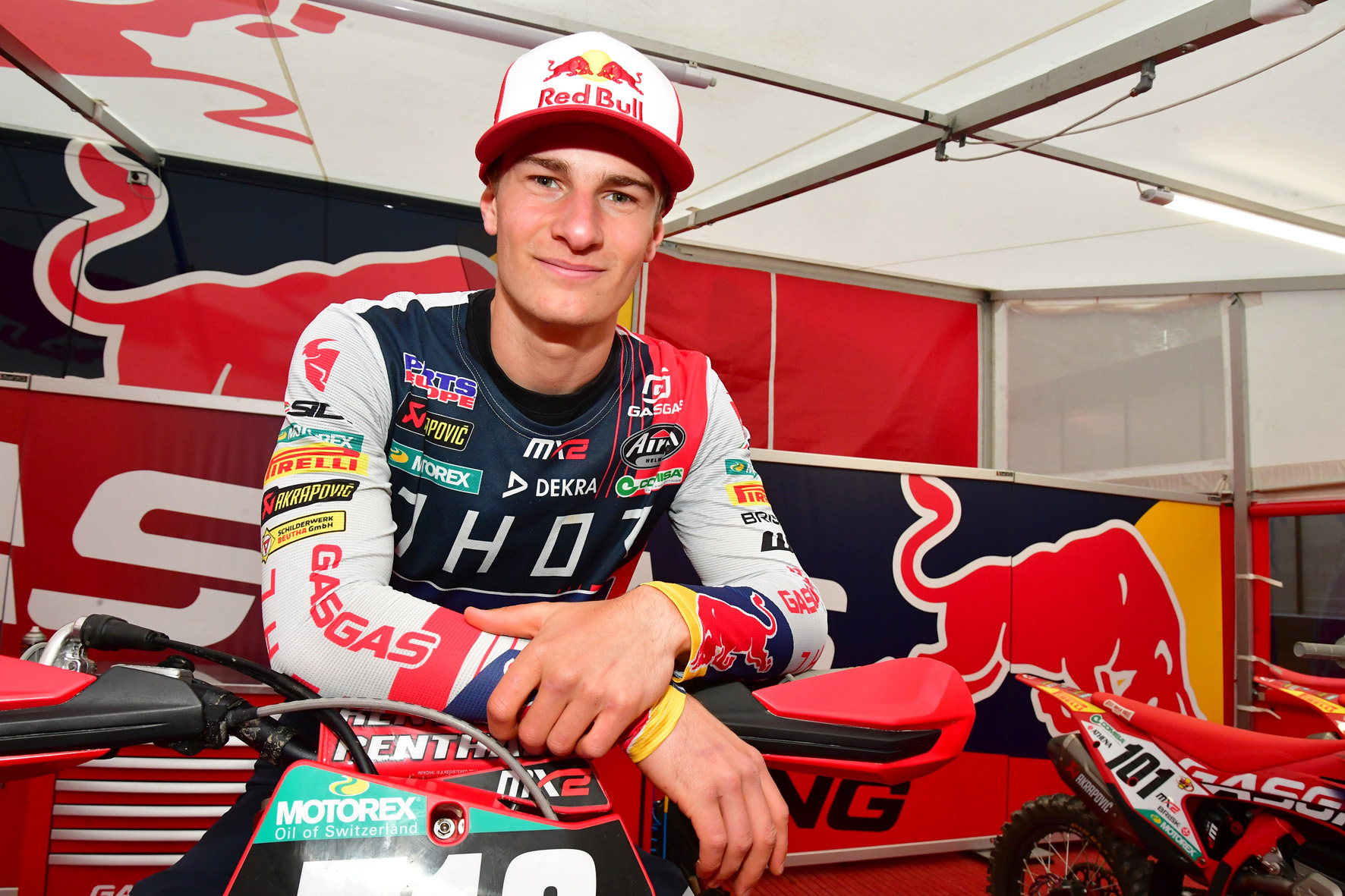 Die Fahrer mit den größten Erfolgsaussichten auf die vordersten Plätze sind durch die schwarz-rot-goldene Brille betrachtet in der Klasse MX2 am Start. Allen voran der Oberfranke Simon Längenfelder. Der 18-Jährige vom Team Red Bull GasGas Factory Racing startete mit einem echten Kracher in die Saison 2022. Bei Saisonauftakt Ende Februar im englischen Matterley Basin gelang ihm mit gleich zwei Heat-Siegen sein erster GP-Triumph. Mit weiteren Top-Resultaten liegt er derzeit hinter den beiden Haupttitelanwärtern Jago Geerts aus Belgien und dem Franzosen Tom Vialle auf Tabellenrang drei in Lauerstellung. „Nachdem ich im vorigen Jahr Gesamtzehnter geworden bin, wusste ich, dass wenn ich über den Winter gut arbeite und mich gut entwickle, ich auch ganz vorn mitfahren kann, auch weil nicht mehr viel gefehlt hatte“, erklärt Simon Längenfelder zu seinem Sprung an die Weltspitze. Und weiter: „Die Saison fing mit dem Doppelsieg mega gut an, dann hatte ich ein kleines Loch mit ein paar Stürzen, aber zuletzt ging es wieder aufwärts. Demnächst wieder aufs Podium wäre richtig gut.“