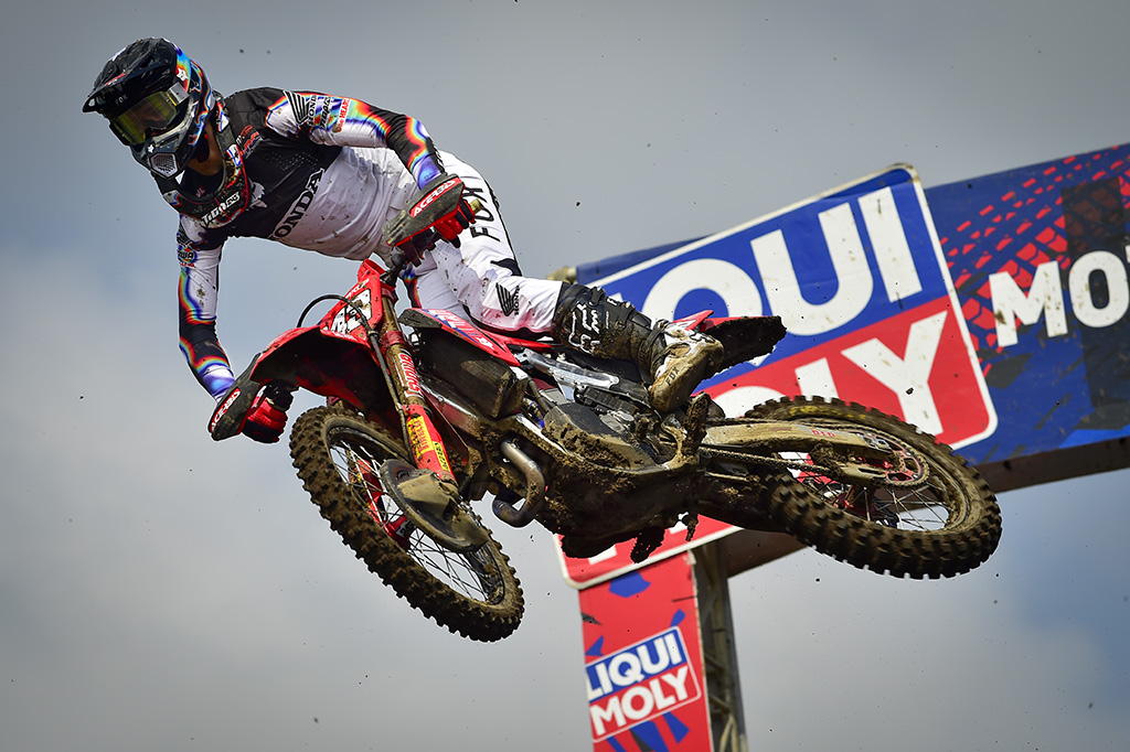 Although the holeshot went to Nestaan Husqvarna Factory Racing star Mattia Guadagnini, Prado took over the lead exiting the second corner, as Gajser got held up briefly in a battle with fast-starting home hero Henry Jacobi on his Sarholz KTM Racing Team machine! Herlings was quickly up into fifth, but Romain Febvre had only qualified in 27th for the Kawasaki Racing Team. The Frenchman battled hard through the pack, once more finding speed in the rain when others were floundering.