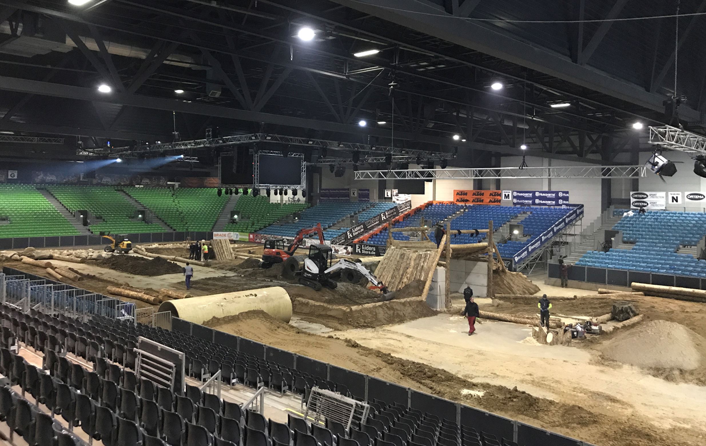 Bevor es jedoch für die Akteure ernst wird, haben die Organisatoren, die Eventmanufaktur Auerswald aus Hohndorf bei Stollberg, und ganz aktuell die Streckenbauer noch eine Menge Arbeit vor sich. Nachdem man bereits Anfang der Woche, also noch im alten Jahr, einen Großteil des festen Materials wie große Baumstämme, Dumperreifen, Flusssteine etc. in die Halle transportiert hat, werden seit dem heutigen Donnerstag dutzende Lkw-Ladungen mit Erde und Sand eingebracht und die Strecke sprichwörtlich modelliert. „In diesem Jahr ist unser Zeitplan durch den kurzen Abstand zwischen Silvester bzw. Neujahr und dem Veranstaltungstag noch enger gestrickt, aber wir liegen gut in der Zeit“, erklärt Daniel Auerswald am Nachmittag des 2. Januar. Dazu ergänzt sein Bruder Tobias: „Wir haben ein sehr ehrgeiziges, engagiertes und mittlerweile eingespieltes Team. Die Streckenabnahme seitens des Serienpromoters bzw. dem Motorrad-Weltverband FIM ist zwar erst am Freitagnachmittag, aber unser Ziel ist es, morgen Früh nur noch ein paar kosmetische Arbeiten zu verrichten. Mit einem Geröllfeld, einer Matrix, einer Sandgrube und diversen Sprunghügeln wird die Strecke wieder alle Elemente beinhalten, die eine SuperEnduro-Piste ausmachen. Zudem haben wir erstmals eine Brücke, die gleichzeitig ein Tunnel ist. Ich glaube, damit setzen wir erneut Maßstäbe.“
