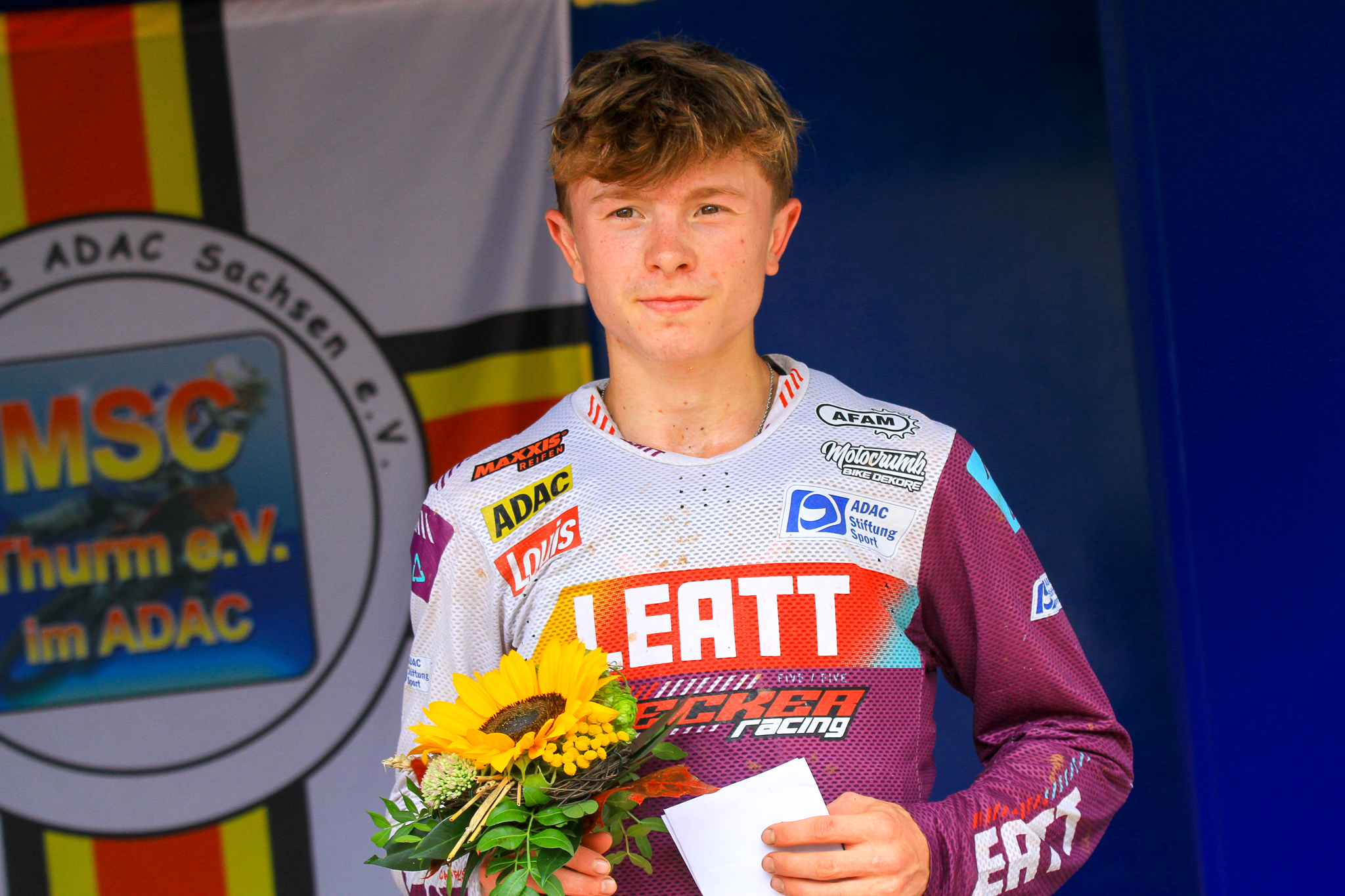 Da der bis dato Führende der 250ccm Meisterschaft seine Saison verletzungsbedingt vorzeitig beenden musste, war der Weg für Marnique frei. So ging er locker und mit möglichst wenig Risiko in den Renntag. Nachdem er sich im Zeittraining auf der noch schlammigen Strecke Platz 6 sichern konnte, ging es in den ersten Durchgang. Hier startete er zunächst gut, erlebte dann aber einen haarigen Moment, an einem Sprung blockierte seine Bremse, er hatte alle Mühe nicht zu Boden zu gehen und musste das Rennen vorzeitig aufgeben. Im zweiten Durchgang fuhr er ein solides Rennen, sicherte sich mit Platz 5 die notwenigen Punkte zur Übernahme der Meisterschaftsführung und ist nun auf einem sicheren Weg zum Deutschen Meisterschaftstitel.