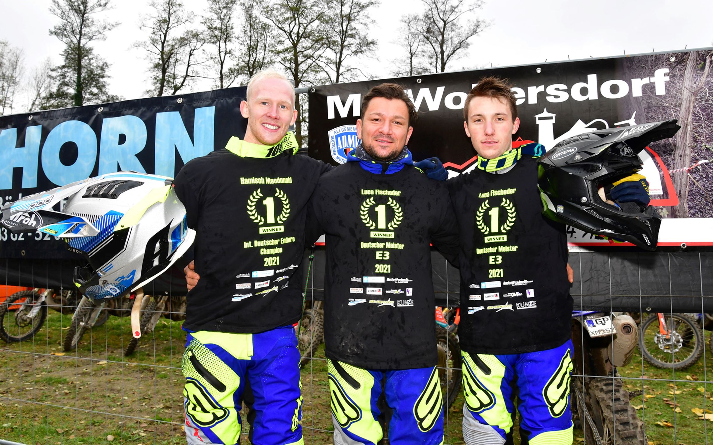 Zum Finale der Int. Deutschen Enduro Meisterschaft reisten Hamish Macdonald und Luca Fischeder mit einem deutlichen Punkteplus in der alle Hubraumklassen vereinenden Championatswertung zum „43. Novemberpokal“ des MC Woltersdorf. Der Tabellendritte, Edward Hübner, hatte lediglich noch eine rechnerische, jedoch kaum realistische Chance auf den Titel. Zwar hatte Hamish Macdonald in der Klasse E2 ebenfalls fast alle vorherigen Rennen gewonnen, doch da der WM-Pilot keine deutsche Lizenz gelöst hat, wurde er in seiner Hubraumkategorie nicht gewertet. Luca Fischeder in der Klasse E3 hingegen sehr wohl. Nachdem er nach allen sechs vorherigen Rennen bei der entsprechenden Siegerehrung in der Mitte Aufstellung nehmen durfte, fehlte ihm zu seinem zweiten nationalen Titel nach seinem Gewinn der DMSB Enduro-Junioren Meisterschaft 2019 im schlechtesten Fall nur noch ein Punkt. Doch auch beim Showdown 2021 am östlichen Stadtrand von Berlin ging alles glatt und die Technik hielt erneut. Und die fahrerische Klasse der beiden 22-Jährigen ist ohnehin über jeden Zweifel erhaben. So kam es, wie es kommen musste – sechster Doppelsieg von sieben möglichen und dazu wieder die Klassensiege in der E2 und der E3.